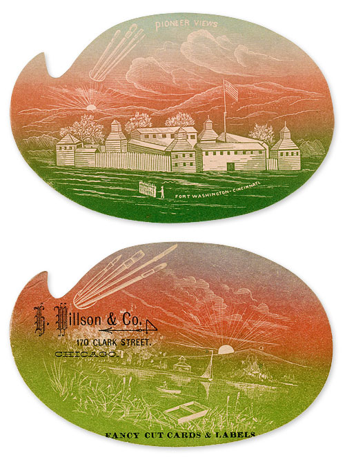 That's because printers created the color spectrum by hand, as shown above, and those three colors would blend into a particularly pleasing spectrum. Most trade cards from the same period were colored through the registration of many lithographed stone plates, so the wash method of colorization was a quick and inexpensive way to achieve "full color."